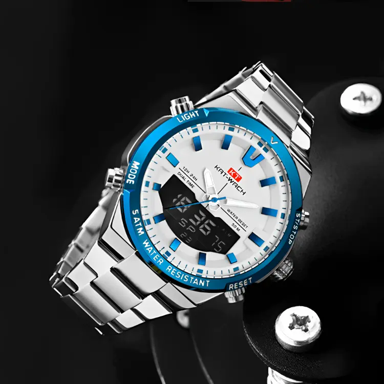 Este reloj de acero inoxidable con cristal de Hardlex está diseñado para ejecutivos que dominan su tiempo: doble hora (digital y análoga), alarma, calendario y cronómetro en un diseño sofisticado. La luz de fondo te respalda en cualquier desafío. No solo uses un reloj, lleva un símbolo de tu éxito. Resistencia al agua de 3ATM (resistente a salpicaduras) ¡Hazlo tuyo ahora!